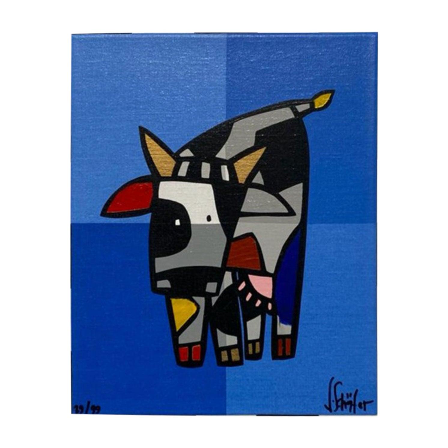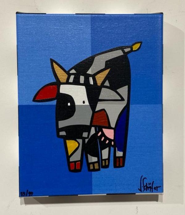 Een mooie ingeschilderde zeefdruk op linnen van kunstenaars Jacqueline Schäfer. Schäfer, ontdekte dat kunst ook een communicatiemiddel was, wat het schilderen voor haar een extra dimensie gaf. Ze creëert een wereld waarin de vormen van haar figuren herkenbaar en zeer uniek zijn.