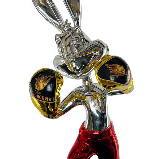 Zilveren beeld van Bugs Bunny konijn met gele bokshandschoenen met Lamborghini logo