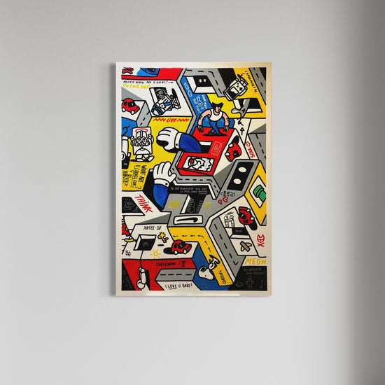 in this superstructured block scenes follow each other showing how many things happen while we are observing. Woodstock is lost and he is looking for Snoopy while Wolverine is walking close to Einstein poster. The walls are full of positive writing , everything is connected to the ideal city in the head of the artist and all its favorite icons are present.
