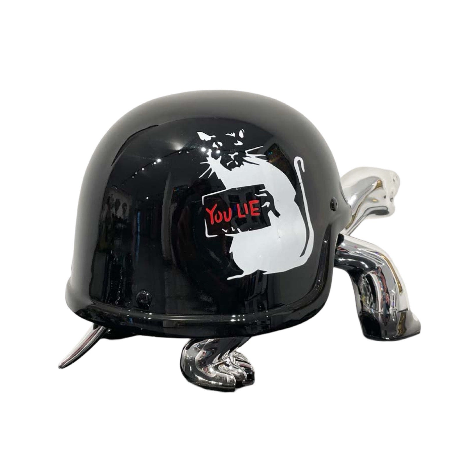 Van Apple created the Peace Turtles on his own artistic way. He gave the turtles a helmet instead of their shell, to show his love and respect for these protected species. The turtles are created in gold to express their value and are given a colorful and contemporary helmet, each design makes a statement.