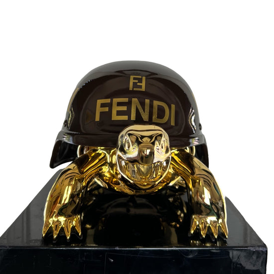 Van Apple created the Peace Turtles on his own artistic way. He gave the turtles a helmet instead of their shell, to show his love and respect for these protected species. The turtles are created in gold to express their value and are given a colorful and contemporary helmet, each design makes a statement.
