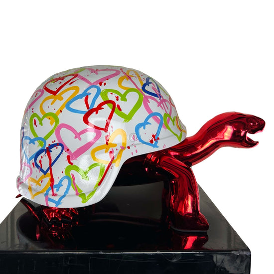 Van Apple created the Peace Turtles on his own artistic way. He gave the turtles a helmet instead of their shell, to show his love and respect for these protected species. The turtles are created in gold to express their value and are given a colorful and contemporary helmet, each design makes a statement.